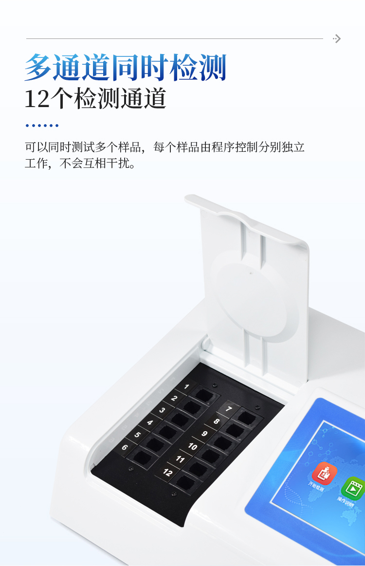 4、检测通道:≥12个检测通道,可以同时测试多个样品,每个样品由程序控制分别独立工作,不会互相干扰。