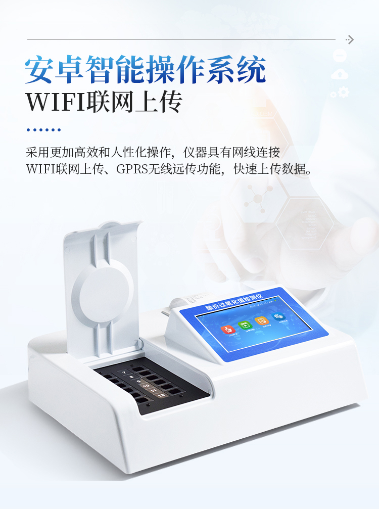 1、安卓智能操作系统,采用更加高效和人性化操作,仪器具有网线连接、wifi联网上传、GPRS无线远传功能,快速上传数据。