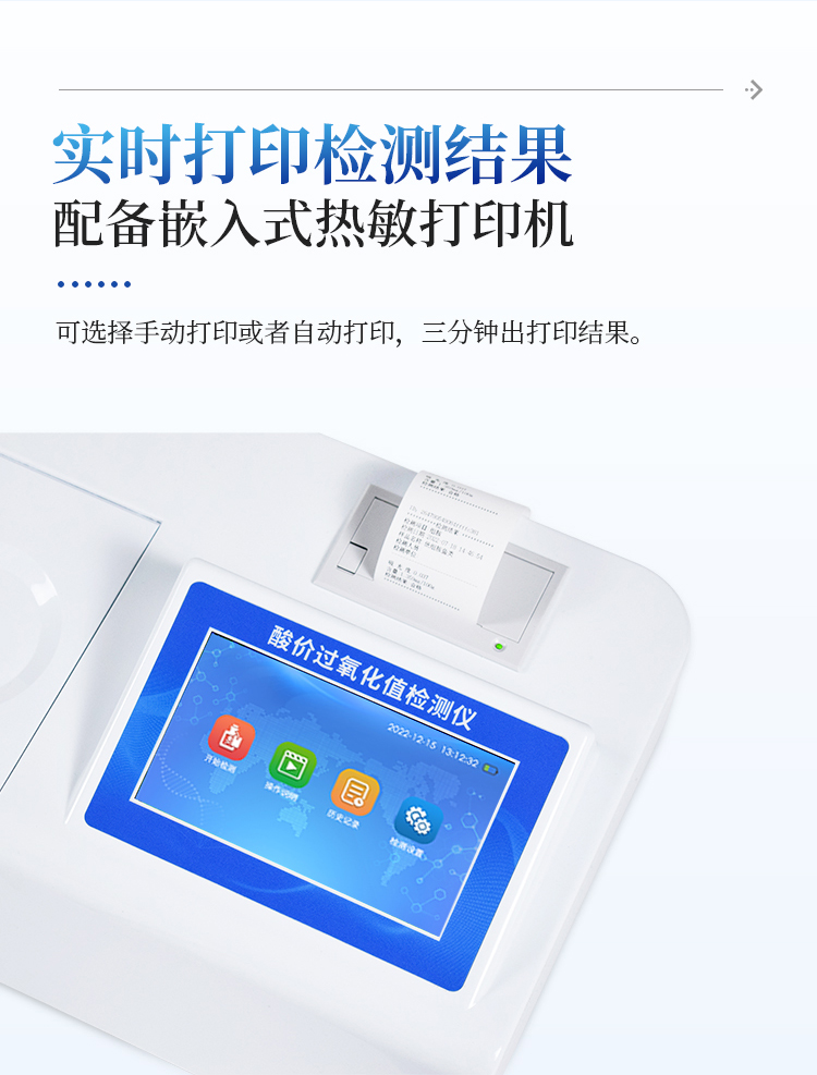 5、配备新一代嵌入式热敏打印机,可选择手动打印或者自动打印,检测完成可自动打印检测报告和二维码。