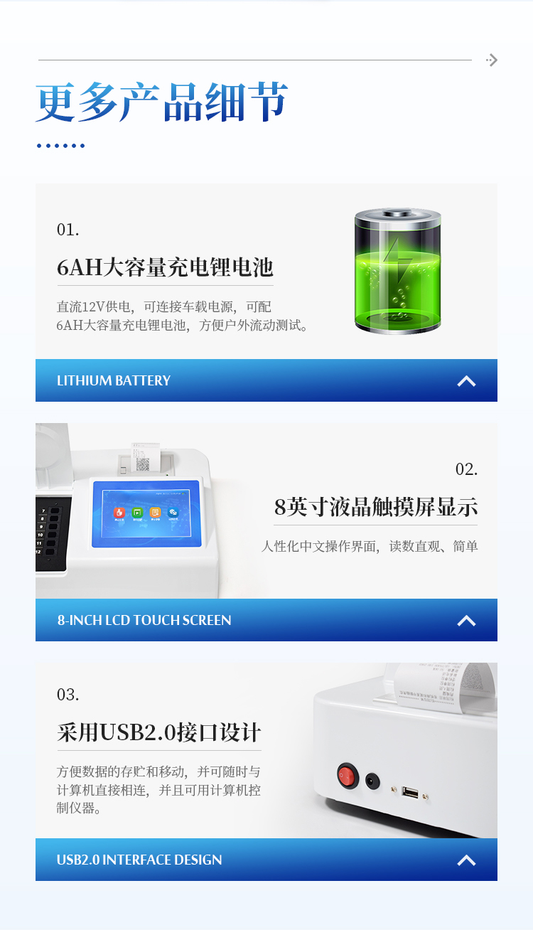 7、采用标准USB2.0接口设计,支持U盘存储,免驱动安装,方便数据的存贮和移动,并可随时与计算机直接相连,并且可用计算机控制仪器。实现数据查询、浏览、分析、统计、打印等。